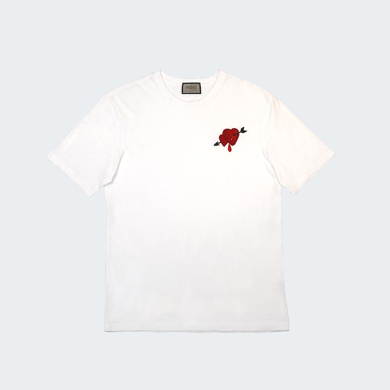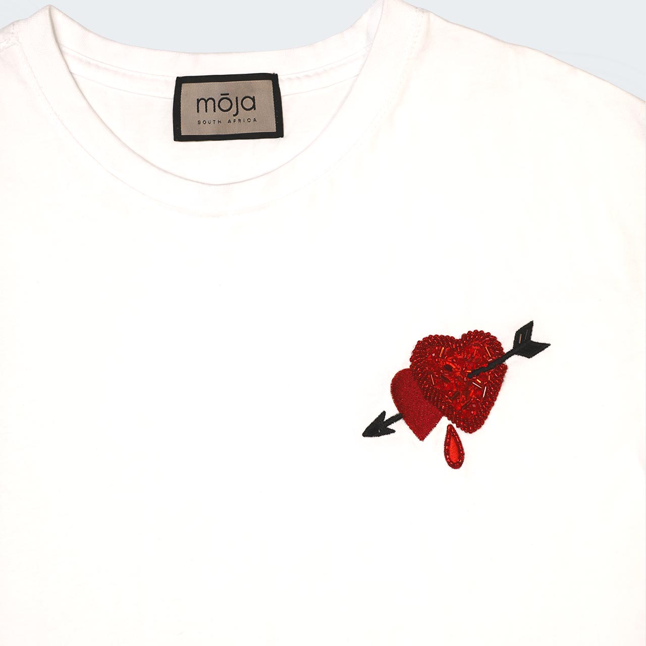 Stretch cotton T-shirt featuring a round neck and short sleeves. This cotton T-shirt is defined by embroidered hearts and an arrow with beaded elements.