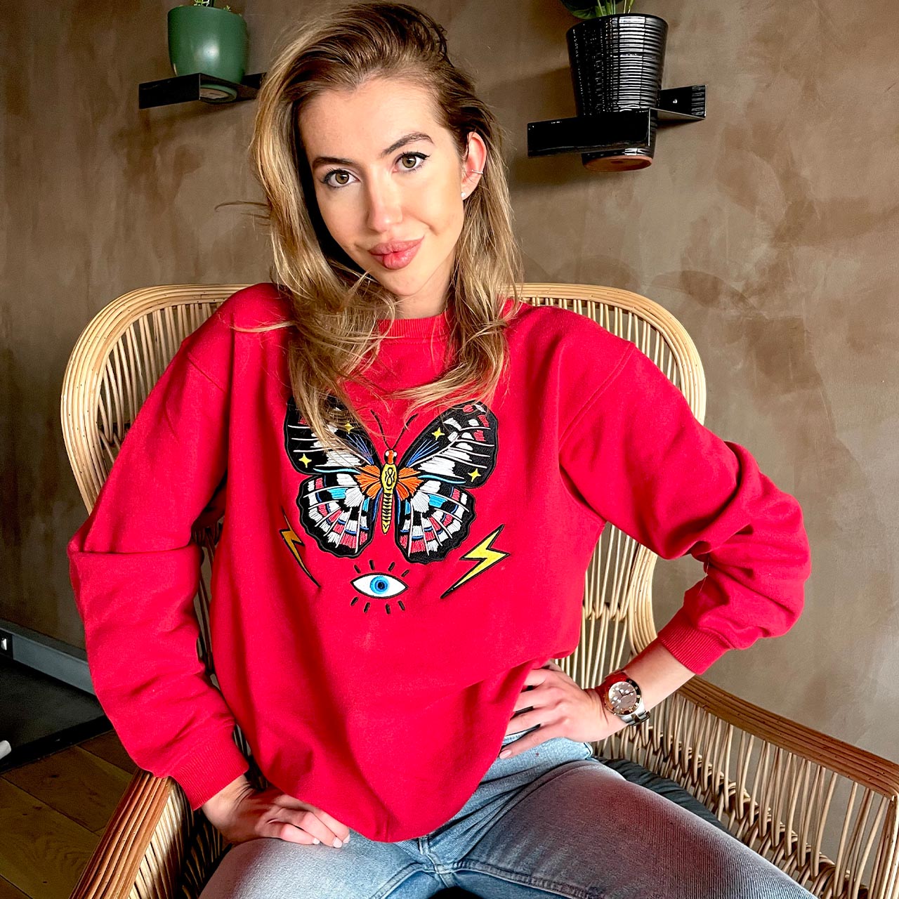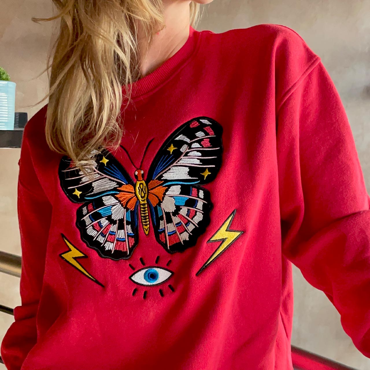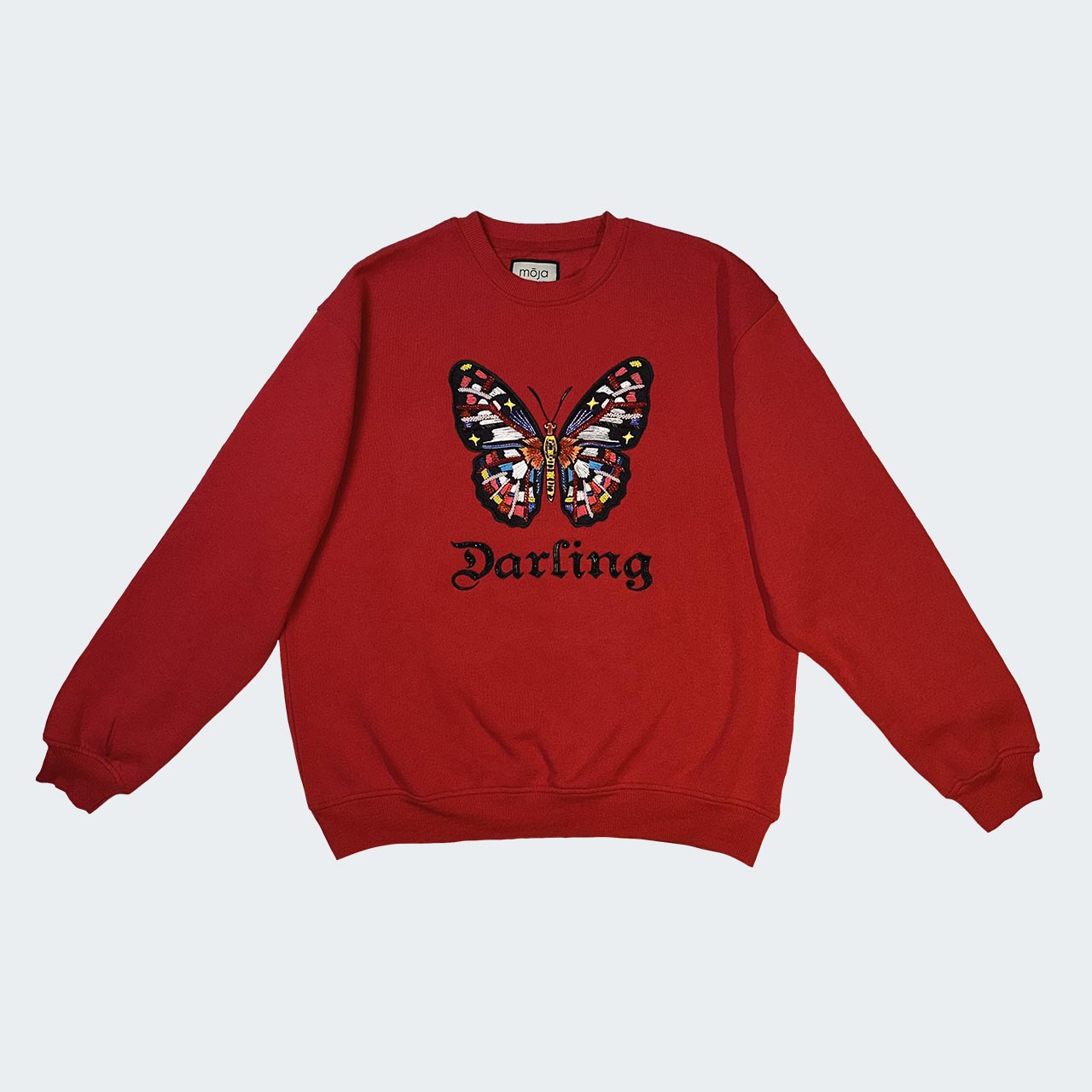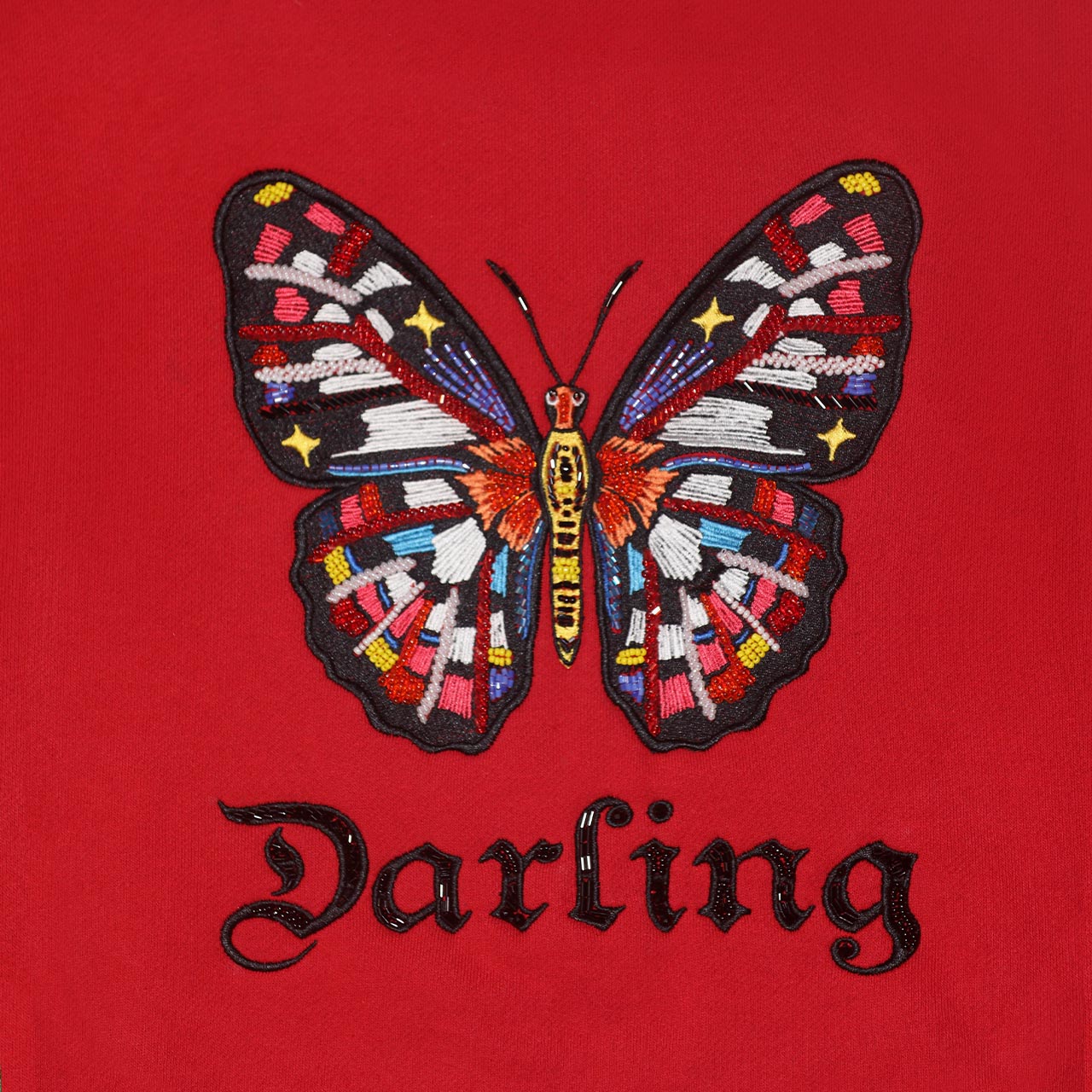 The ready-to-wear sweatshirt has everything you need, both in style and comfort. This jersey sweatshirt is defined by the vibrant embroidered and beaded design of a butterfly with the word “Darling” underneath. The artwork by South African based illustrator, Ksenia Sadovnik, adds an arty touch inspired by beauty and magic of nature.
