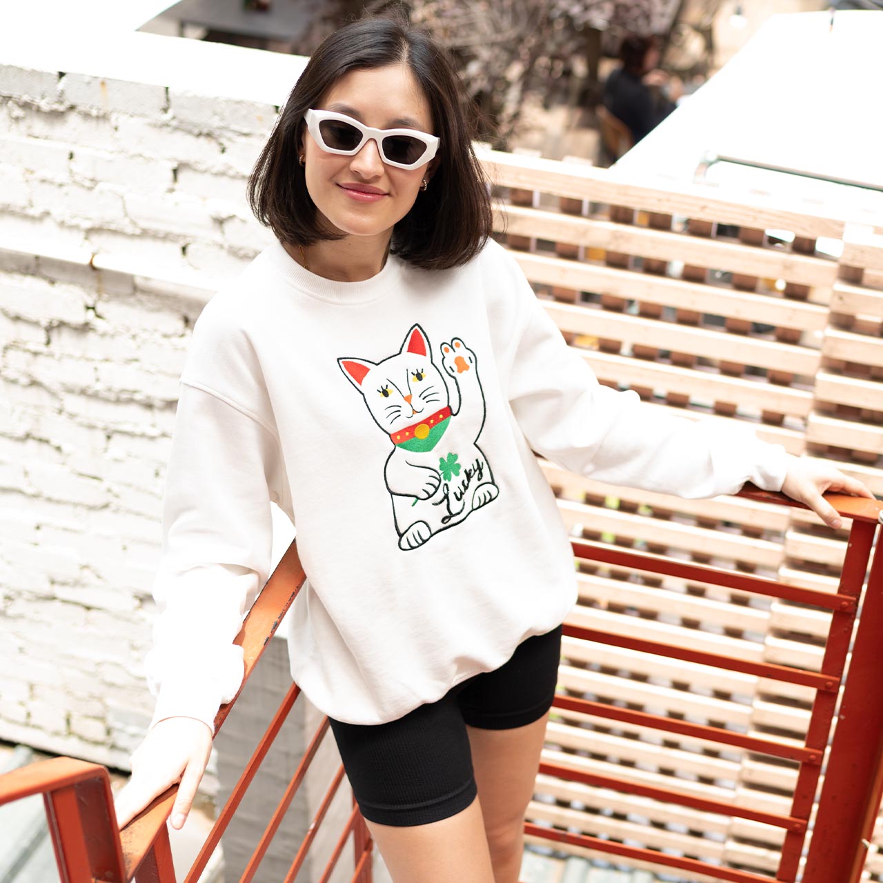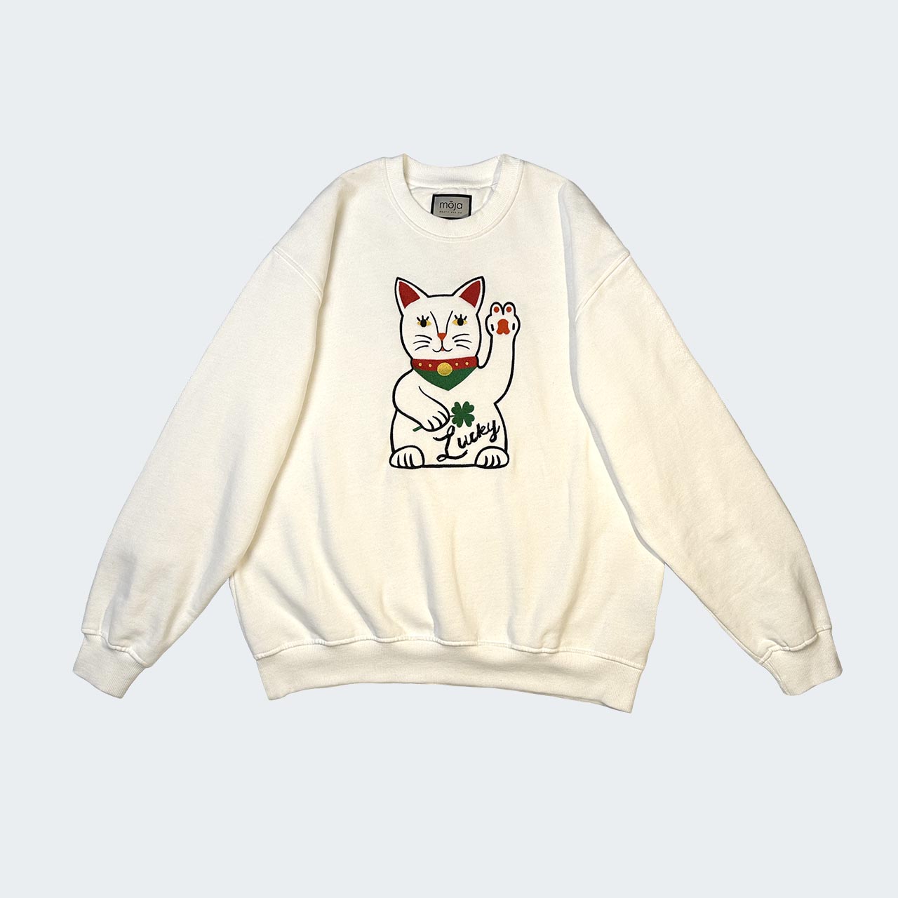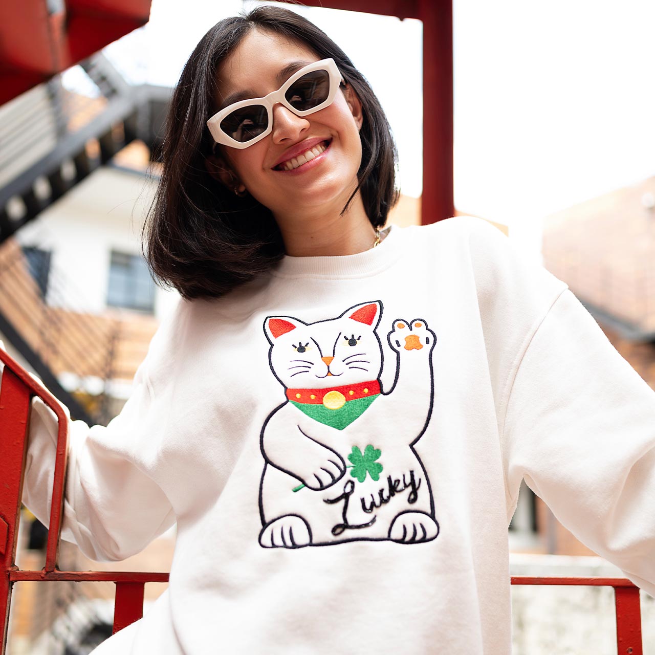 This ready-to-wear sweatshirt features a “Lucky cat” embroidery with beaded elements on the front. The artwork by South African based illustrator, Ksenia Sadovnik, adds a playful twist to this jersey.