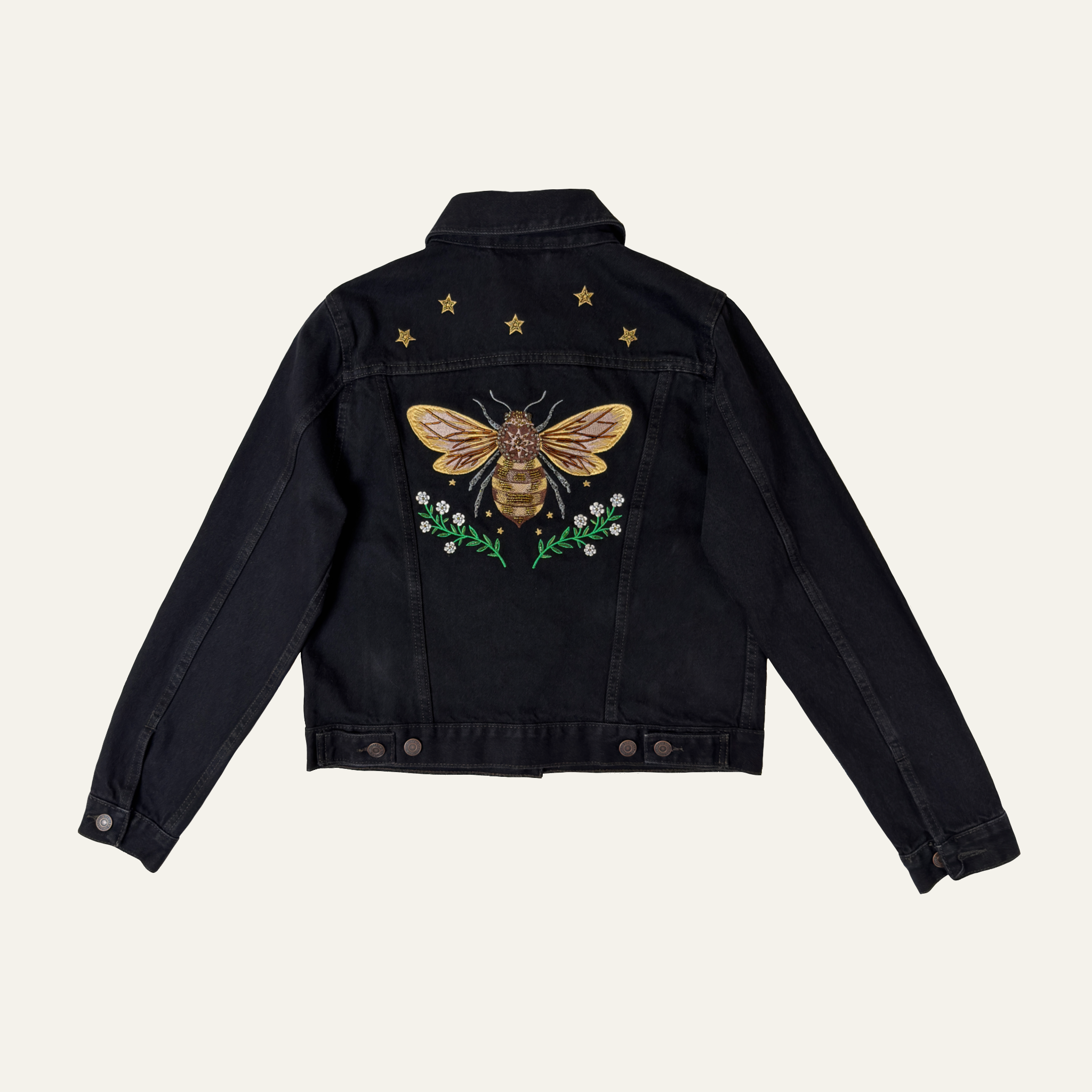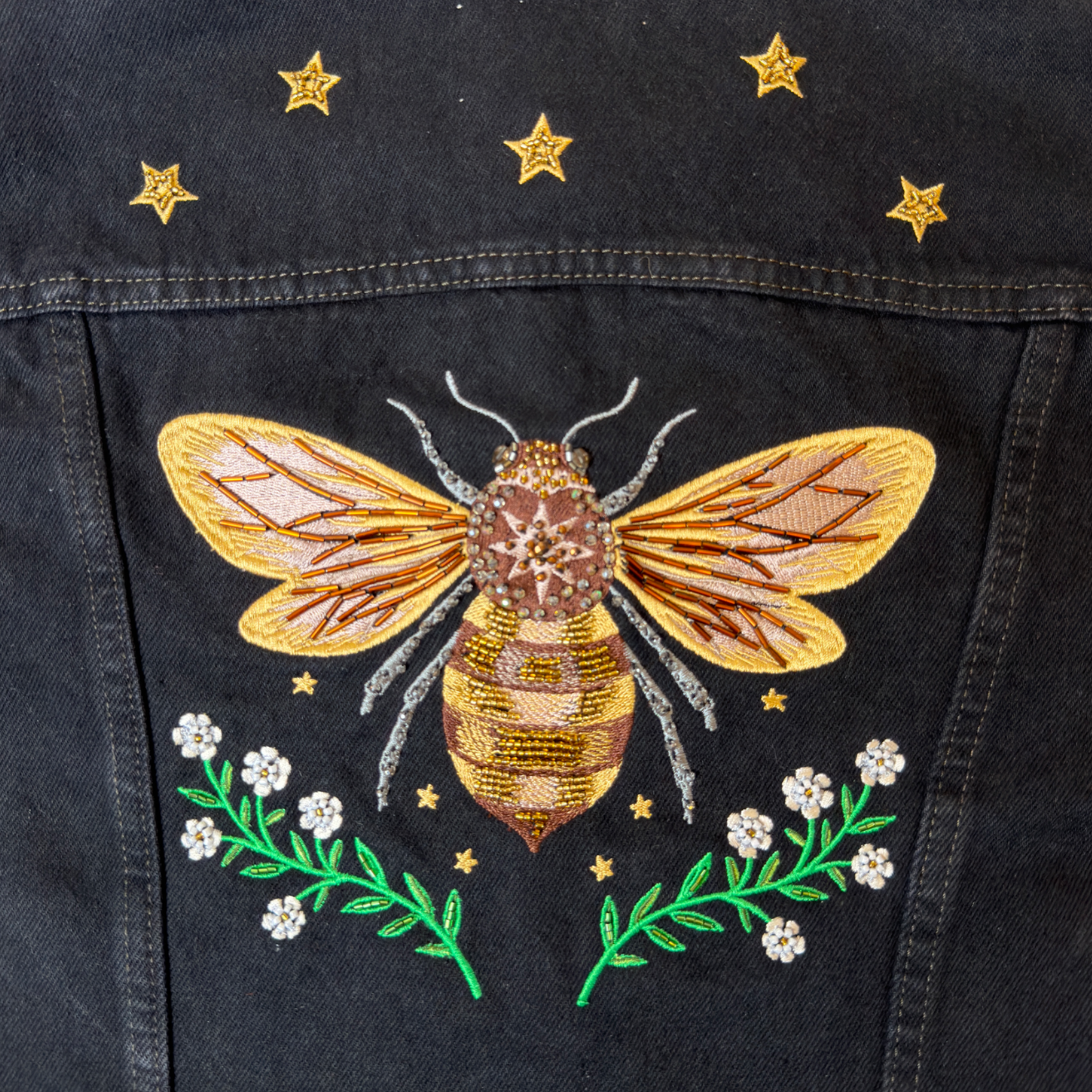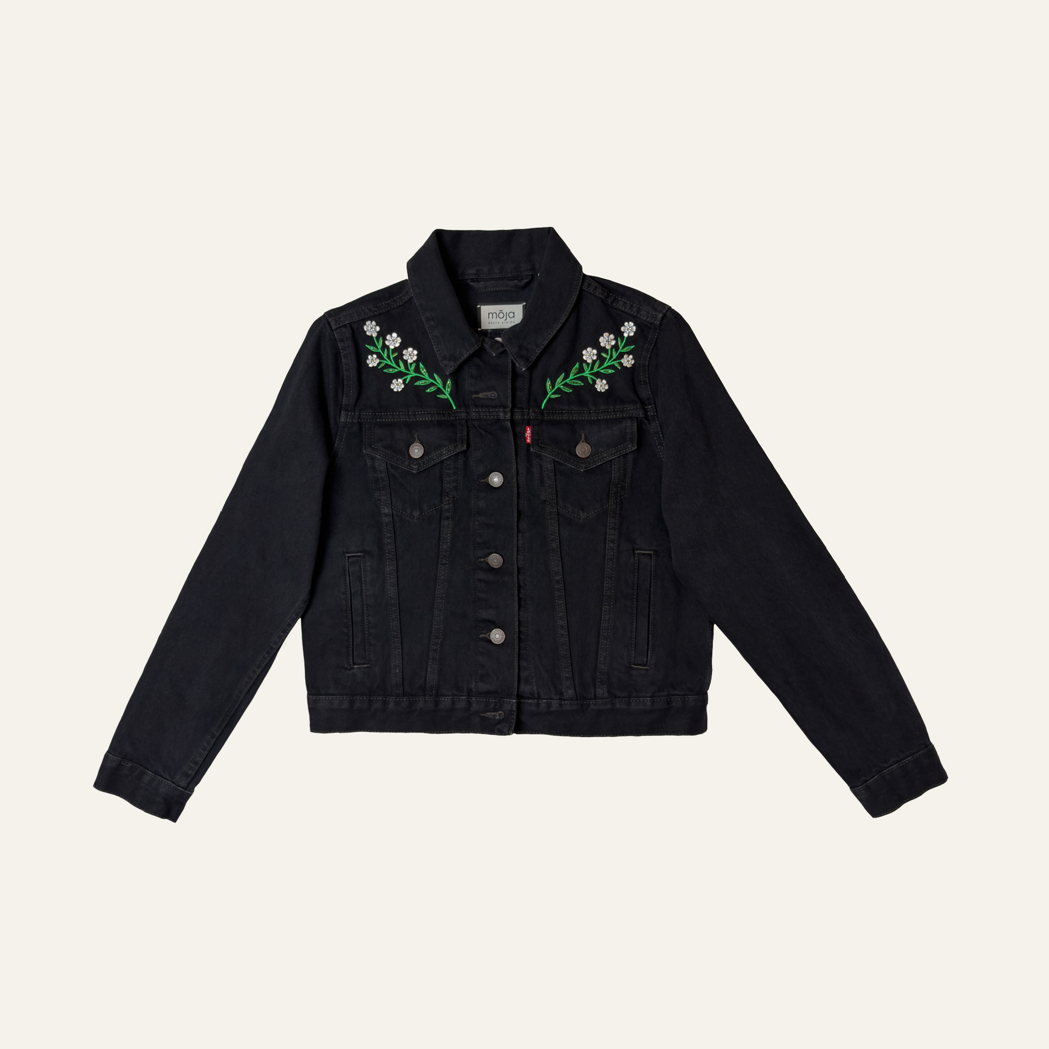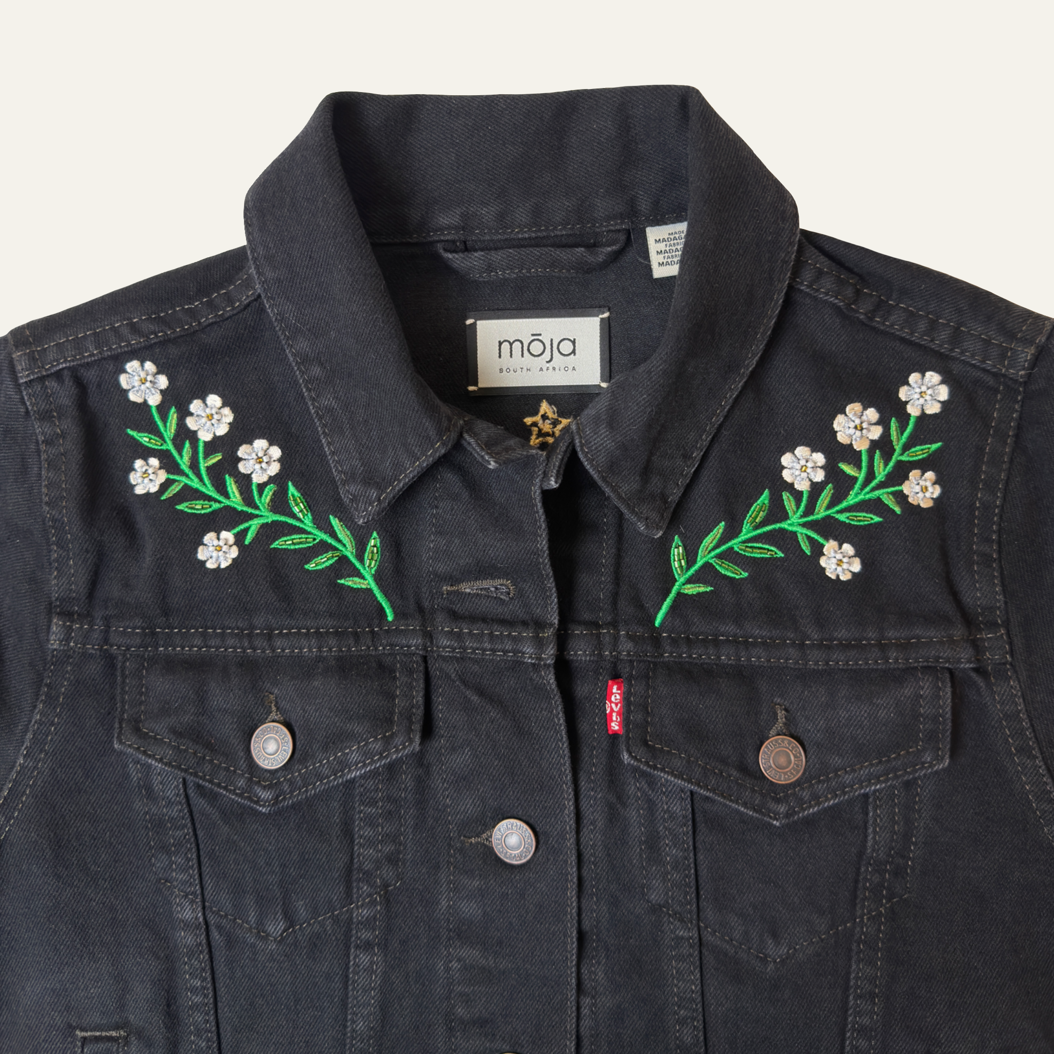 Original Levi’s denim jacket featuring long sleeves with cuffs. Front button fastening. The artwork by illustrator and designer, Ksenia Sadovnik, adds an arty touch to this jacket with embroidered and hand-beaded designs. Designed and executed in Johannesburg, South Africa.