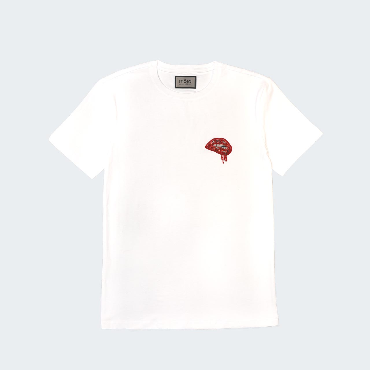 Stretch cotton T-shirt featuring a round neck and short sleeves. This cotton T-shirt is defined by beaded lips with tussles.