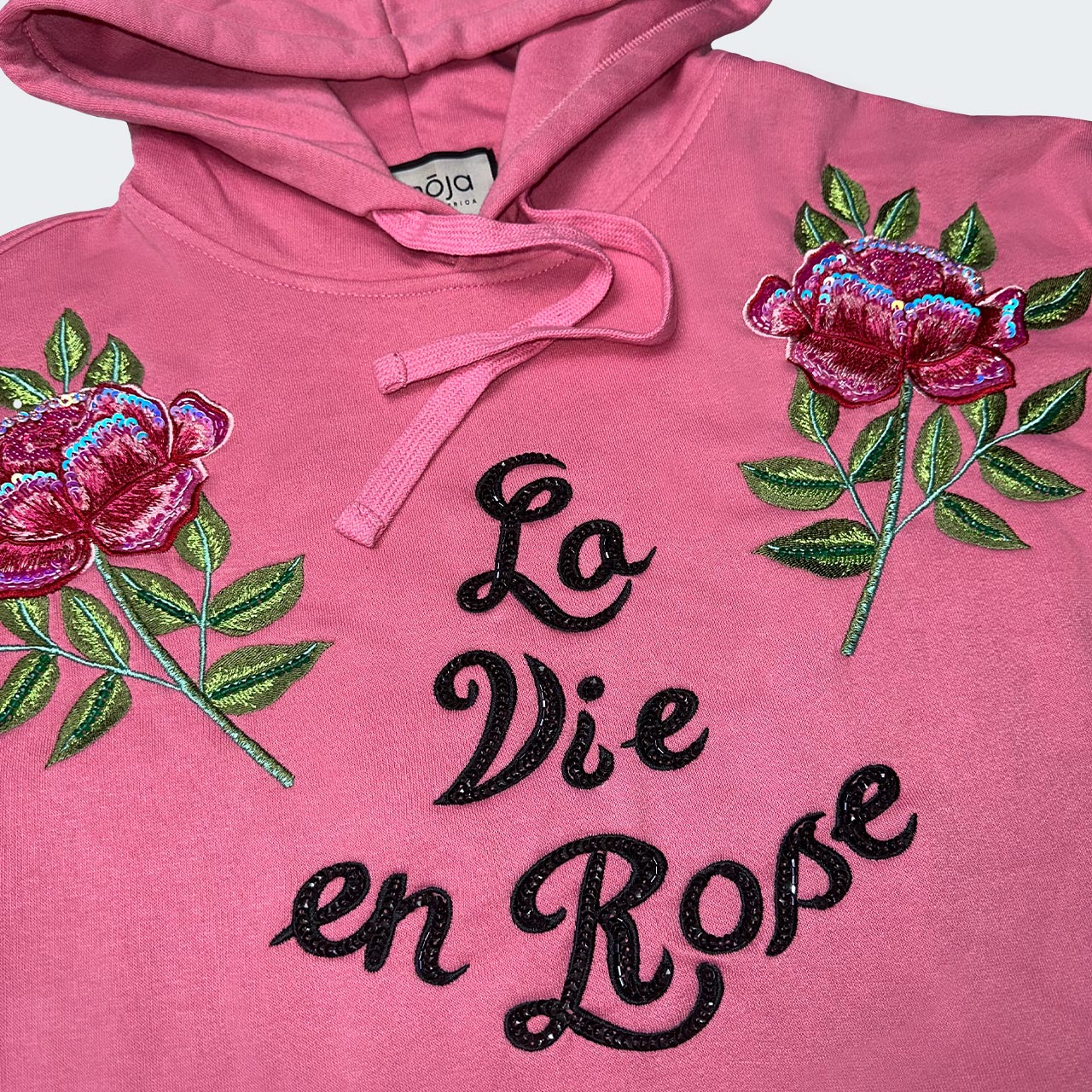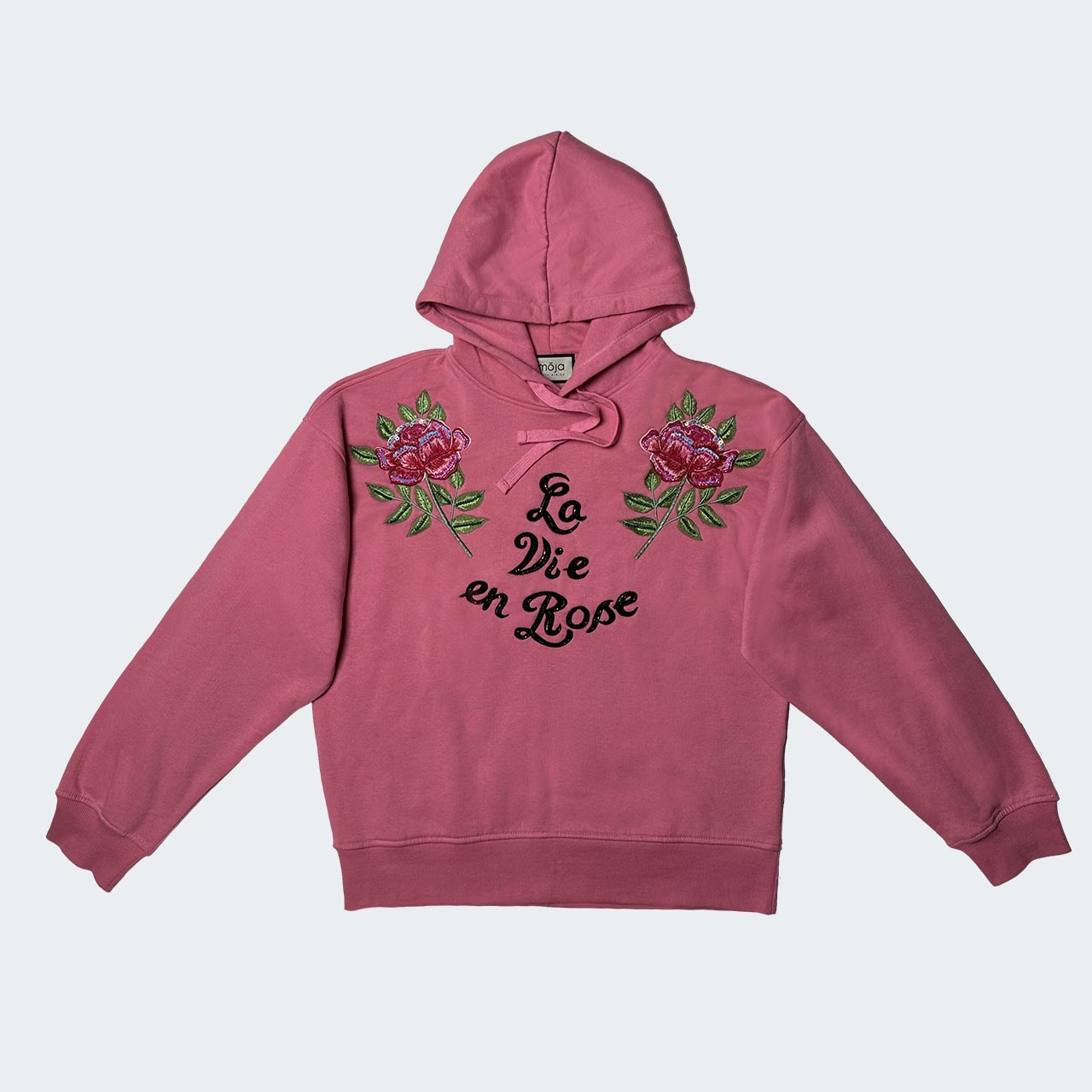 Presented in a pink fleece jersey, this hooded sweatshirt features two embroidered and beaded roses accomplished with “La vie en rose” logo with sequins on the front. A fixed hood with drawstring closure and elastic waistband completes the design.