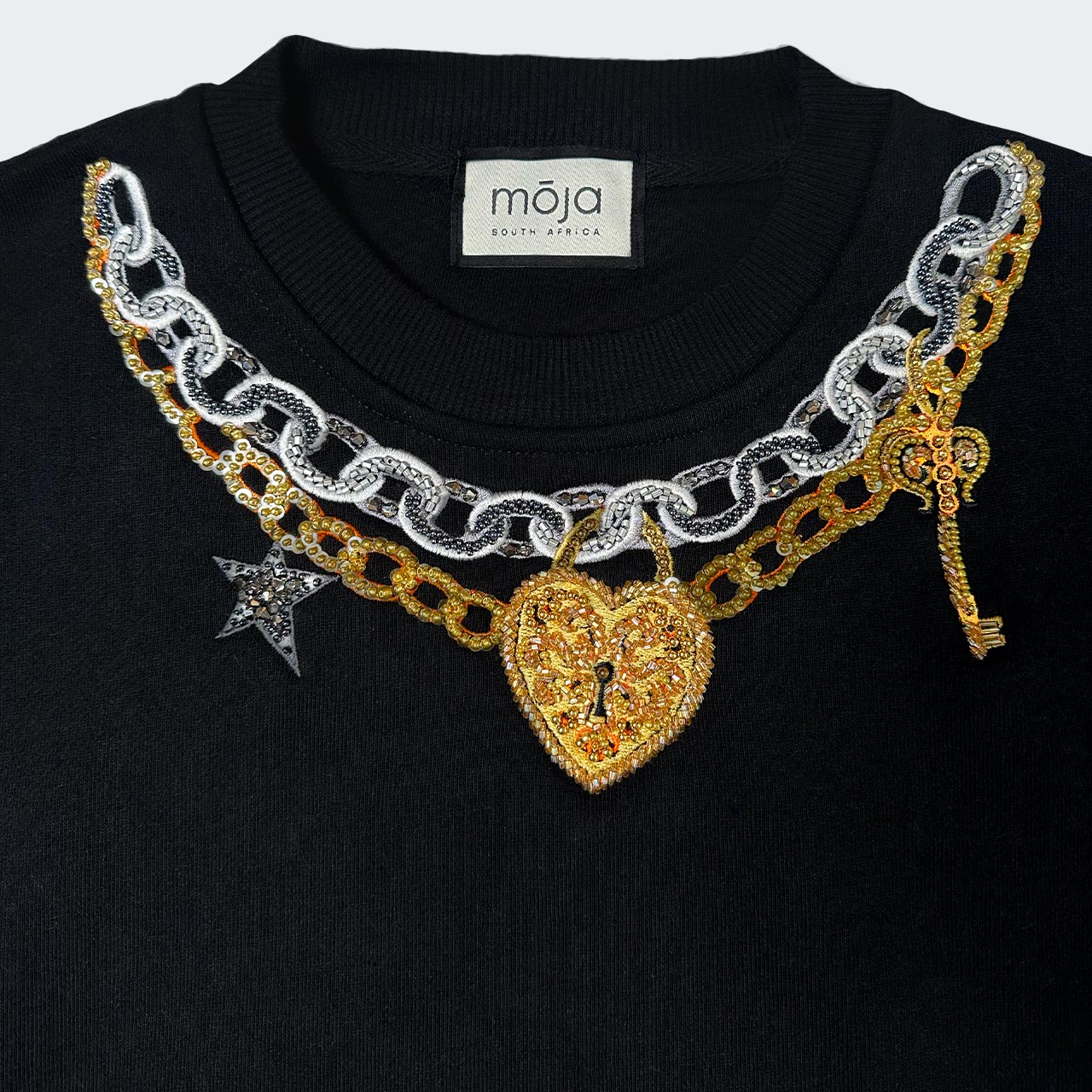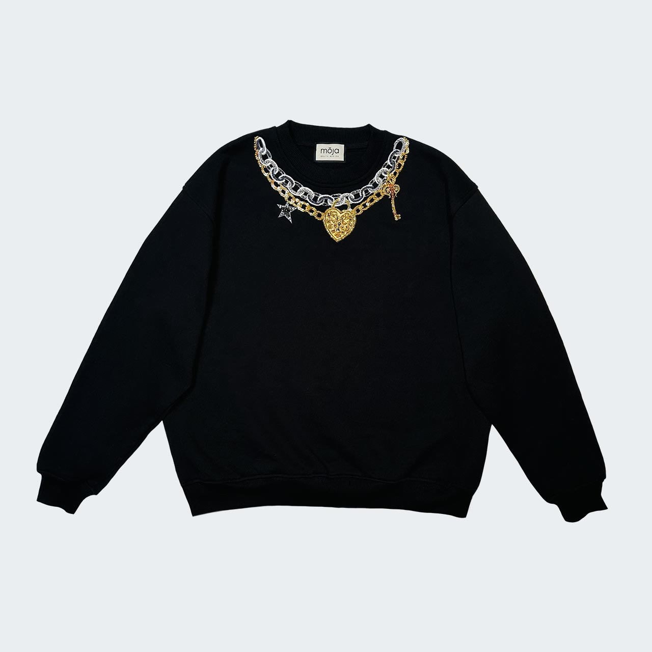 The ready-to-wear sweatshirt has everything you need, both in style and comfort. This jersey sweatshirt is defined by sparkling imagery of chains implemented with different types of beads.