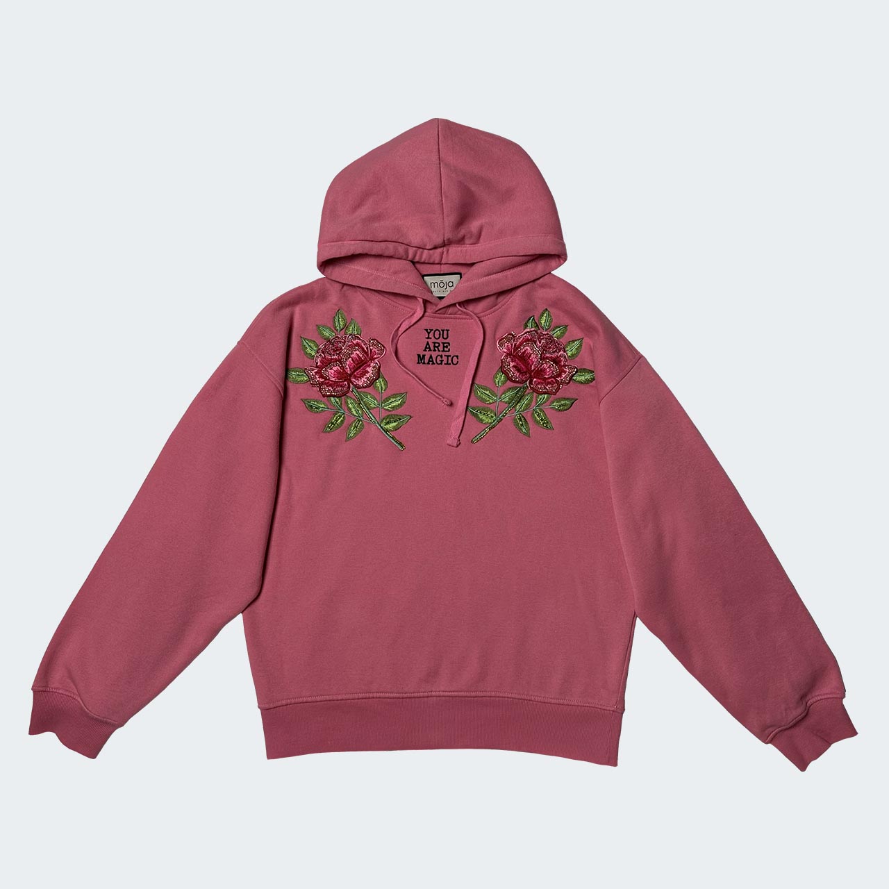 Ready-to-wear hoodie with an adjustable drawstring hood, long sleeves, and ribbed trims has everything you need, both in style and comfort. Presented in a pink fleece jersey, this hooded sweatshirt features two embroidered and beaded roses with the “You are magic” embroidery.